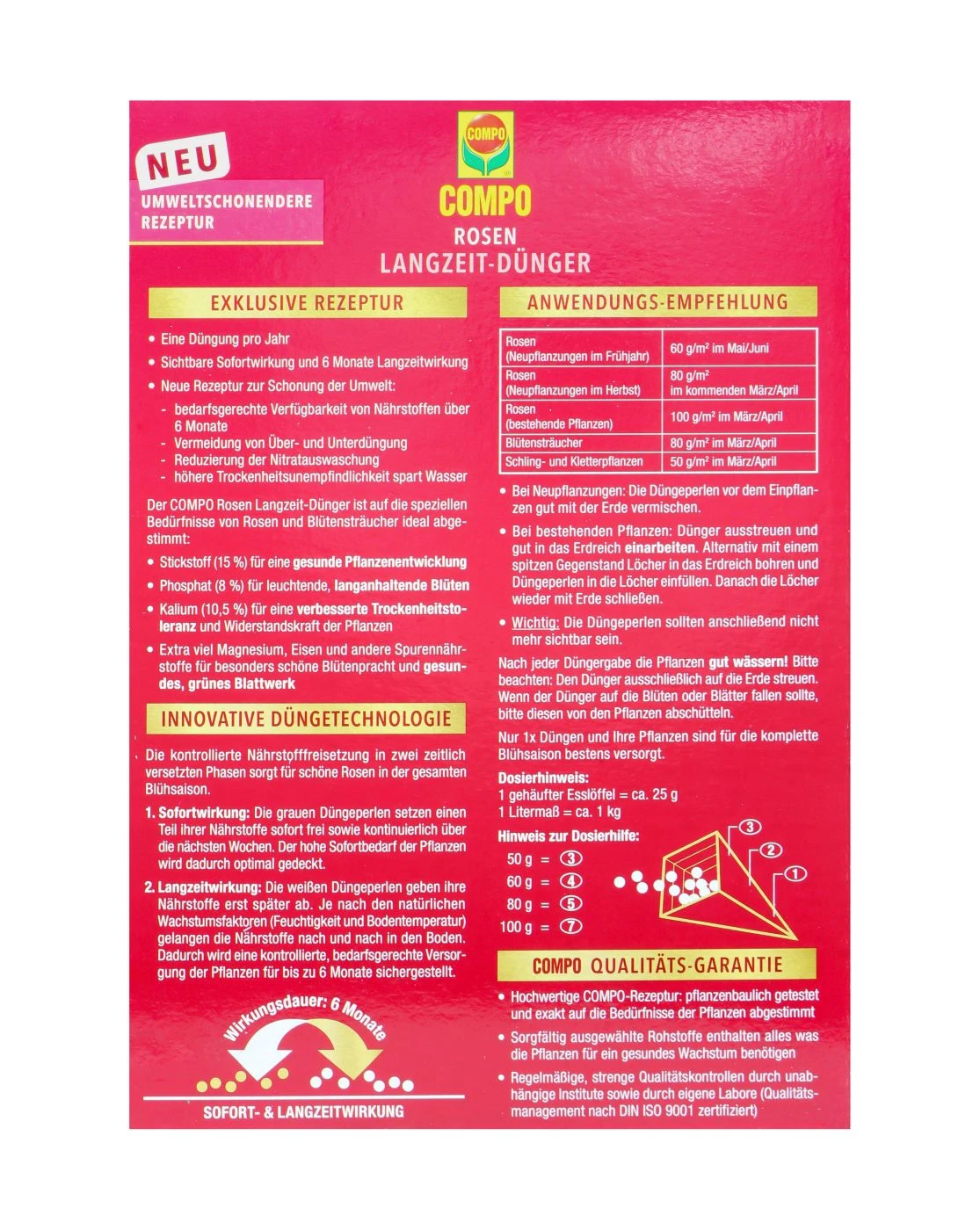 Die hellen Perlen des Düngers versorgen deine Lieblinge sofort mit den Grundnährstoffen. Die umhüllten Perlen sorgen für eine langfristige Nährstoffzufuhr und das für bis zu 6 Monaten. So reicht 1 Mal düngen für eine komplette Saison.
