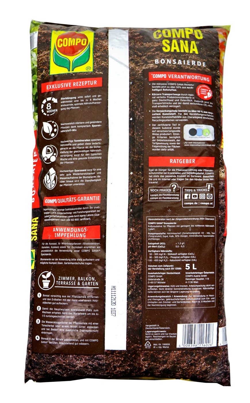 Die qualitativ hochwertige Spezialerde von Compo ist ein Eldorado für Bonsais. In dieser Erde fühlen sich deine grünen Freunde besonders wohl. Das liegt zum einen an der hervorragenden Nährstoffversorgung und wahrscheinlich daran, dass die Erde mittlerweile aus 50 % nachhaltigen Rohstoffen besteht. Die Erde garantiert optimale Wasseraufnahme und fördert dadurch die Standfestigkeit des Bonsais.