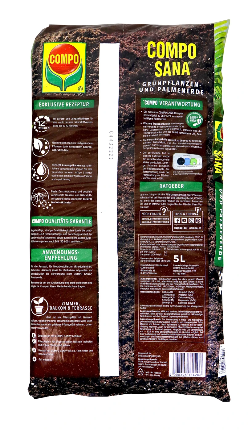 Die qualitativ hochwertige Spezialerde von Compo ist ein Eldorado für Grünpflanzen- und Palmen und Farne. In dieser Erde fühlen sich deine grünen Freunde besonders wohl. Das liegt zum einen an der hervorragenden Nährstoffversorgung und wahrscheinlich daran, dass die Erde mittlerweile aus 50 % nachhaltigen Rohstoffen besteht. Gut für dich und gut für die Umwelt!