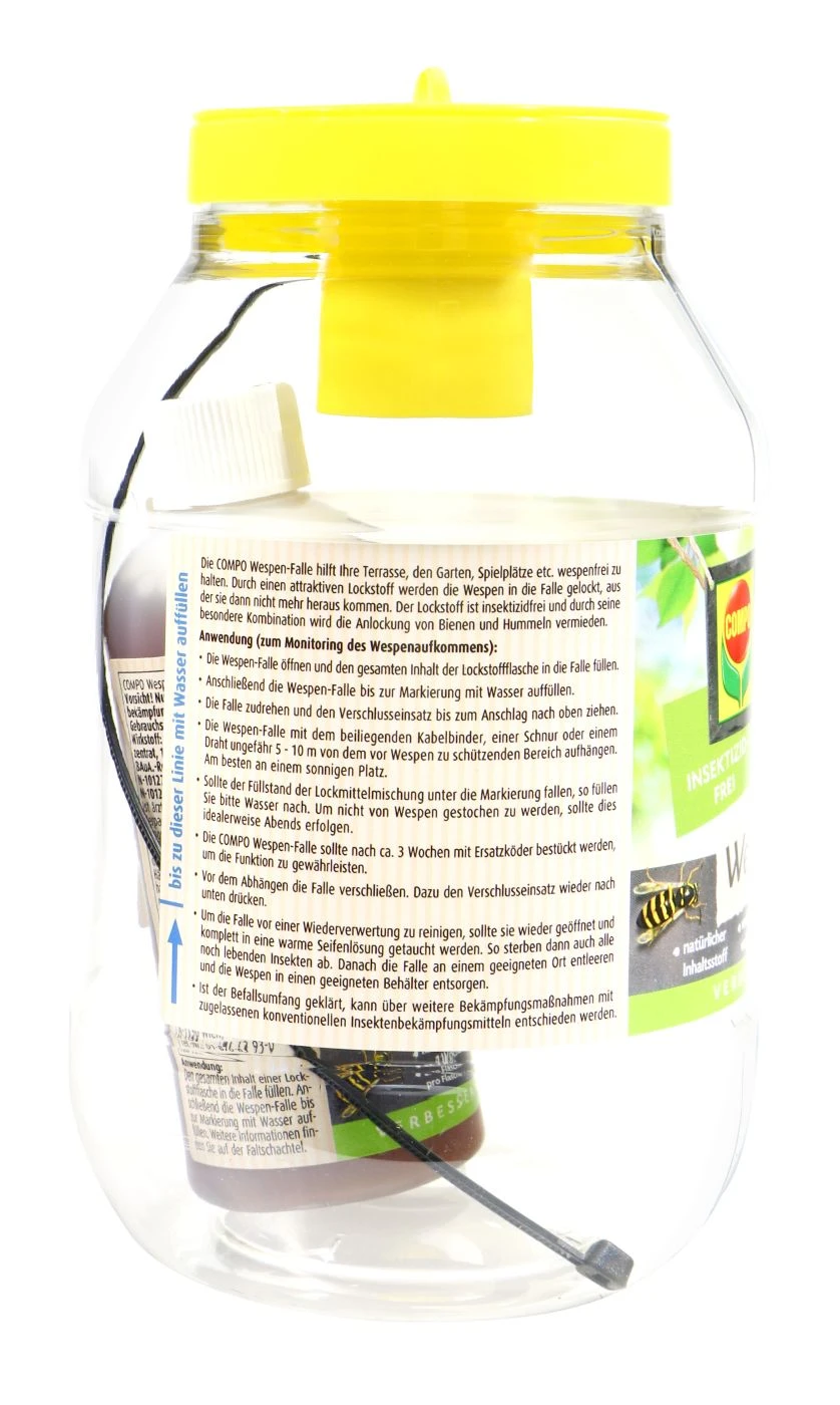 Gelber Angriff auf dem Balkon! Wenn Wespen sich auf den Weg zu deiner Terrasse machen, ist deine Cola, dein Stück Kuchen oder auch dein vierbeiniger Freund wohlmöglich in Gefahr. Abhilfe schafft die Wespen-Falle von Compo. Diese ist mit einem Lockstoff versehen, der die Wespen anlockt und in der Falle hält. Das Produkt zum Monitoring des Wespenaufkommens ist insektizidfrei. Die Wirkung des Lockstoffes wirkt bis zu 3 Wochen.