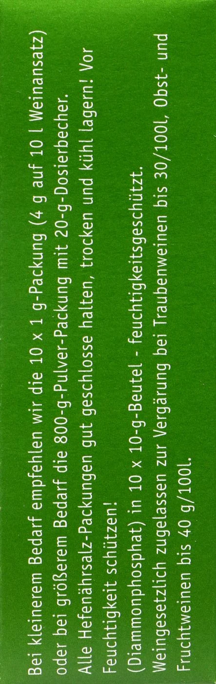Hefenährsalz von Kitzinger gibt der Hefe überlebensnotwenige Stickstoffverbindungen, wodurch die Leistungsfähigkeit gesteigert wird. Die Zellvermehrung wird erhöht und die Endvergärung tritt schneller ein.
